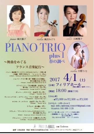 ヴァイオリン・チェロ・ピアノで、トリオ・デュオ・ソロを取り混ぜたコンサートを致します。 Piano Trio plus 1 春の調べ 〜舞曲をめぐるフランス音楽紀行〜 4/1土フィリアホール18時開演@フィリアホール(横浜市青葉区) http://t.pia.jp/pia/event/event.do?eventCd=1661192 「若いヴァイオリニストのためのアルテュール・グリュミオー国際コンクール2015」でグランプリに輝いた、小学校を卒業されたばかりのヴァイオリニスト中野りなさんをゲストにお迎えします。 どなたでも、ぜひご来場ください。 チケットは、チケットぴあ