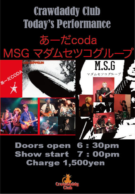 4/1 本日のライブ あーだcoda(as Led Zeppelin) & MSG マダムセツコグループ(as MSG) ライブ OPEN 18:30 START 19:00 CHARGE 1500円