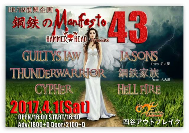 4/1(土)東京 四谷 Outbreak HR/HM復興企画「鋼鉄のManifesto Vol.43」 OPEN 16:00/START 16:40 チケット:前売り\1,800/当日\2,100(ドリンク代別途) ・出演バンド CYPHER HELL FIRE JASONS THUNDERWARRIOR 鋼鉄家族 GUILTYS LAW http://www.hor-outbreak.com/index.php チケットお求めの方は当イベントに参加もしくはコメントをいただければ取り置きいたします。 皆さんのお越しをお待ちしております。