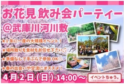 兵庫県で開催! 2017年のお花見in武庫川河川敷 お花見を楽しみながら友達作りをしませんか♪ 場所取り・食材・雨天対策すべてお任せ下さい! イベント内容 1年に1度の大規模お花見イベント! 春の風物詩といえばやっぱりお花見! 桜も!交流も!食べ飲みも!たっぷり楽しめるイベントです☆ 準備や場所取りは専門のプロ業者が用意します。 日よけや雨対策もバッチリです★ 内容たっぷりお花見 お腹いっぱい美味しく楽しめます♪ ビール・酎ハイやソフトドリンク等豊富に準備♪ 桜を見ながらみんなで乾杯しましょう