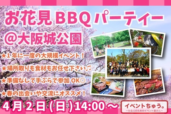 2017年のお花見in大阪城公園 桜やBBQを楽しみながら友達作りをしませんか♪ 場所取り・食材・雨天対策すべてお任せ下さい! ※3/29最新NEWS 現在【女性25名:男性8名】集まっています☆ 女性先行中!男性急募! 女性の参加者様もまだまだ募集中♫ 男女とも申し込みお待ちしています◎ 【その他の日程】 4/1(土)〜4/9(日)までお花見BBQ毎日開催中! 平日は夜桜BBQ★ ▼詳細はこちらから http://event-chu.com/2017_ohanami/ イベント内容 1年に1度の大規模お花見イベント! 春の風物詩といえばやっ