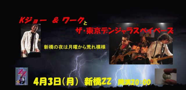 4月3日(月)新橋ZZ http://www.zzpad.com/ 開場18:30 開演19:00 20:00〜 ザ・東京デンジャラスベイベーズ 21:00〜 Kジョー&ウォーク チャージ500円+1ドリンクオーダー つまみ、お茶菓子付