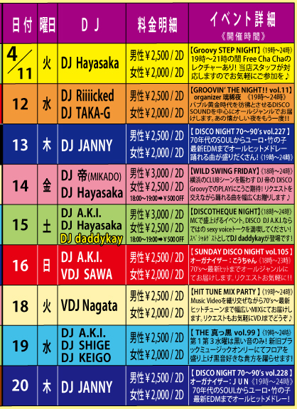 DISCO Groovy 4月の第1&第3火曜日は VDJ Nagataによる【HIT TUNE MIX PARTY】SOUL、FUNK、DANCE CLASSICS、70's〜最新HIT曲までMusic Videoを織り交ぜつつかけまくります!リクエストにも出来る限りお応え致しますのでVDJまでお気軽にどうぞ♪ 【音楽】ALL MIX 【開催時間】19:00〜24:00 【料金】 男性:¥2,500/2Drinks+ビュッフェ付 女性:¥2,000/2Drinks+ビュッフェ付 ビュッフェは数量限定のためなくなり次第終了となります。ご了承ください。 【VDJ】Nagata