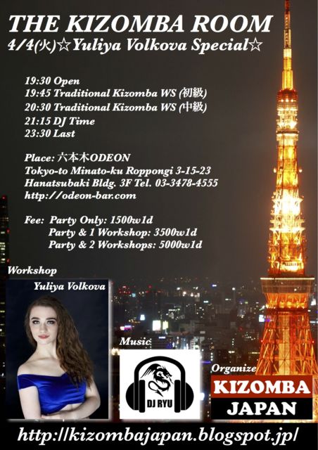 THE KIZOMBA ROOM☆Yuliya Volkova Special☆ 海外ダンサーYuliya Volkovaによるキゾンバワークショップとソーシャルパーティーです。 ワークショップ内容はキゾンバのルーツであるトラディショナルスタイルを学ぶチャンスです。 Kizomba workshop & social party with special guest Yuliya Volkova. Yuliyaの動画です。 https://www.youtube.com/watch?v=n-KQ6wPt8mg https://www.youtube.com/watch?v=ZYYHVPG6E64 ◆日時(Date): 4月4日(火)19:30-23:30 ◆場所(Place): ODEON Tokyo-to Minato-ku Roppongi 3-15-23 Hanats