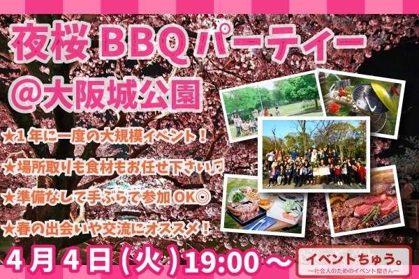 2017年のお花見in大阪城公園 ★4/3最新NEWS 女性17名・男性3名 現在約17名!ちょっぴり女性が先行中です。 男女ともお申込みお待ちしています★ 夜桜やBBQを楽しみながら友達作りをしませんか♪ 場所取り・食材・雨天対策すべてお任せ下さい! /1(土)〜4/9(日)までお花見BBQ毎日開催中! 平日は夜桜BBQ★ ▼別日の日程・詳細はこちらから http://event-chu.com/2017_ohanami/ イベント内容 1年に1度の大規模お花見イベント! 春の風物詩といえばやっぱりお花見! 桜も!交流も!BBQも!たっぷり楽しめるイ
