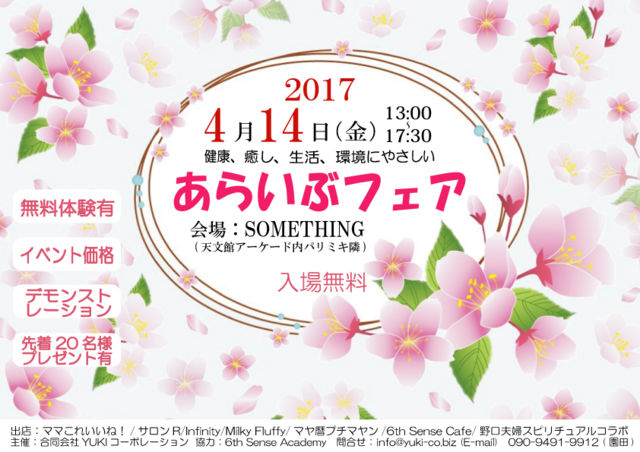 【4/14(金)あらいぶフェア】 天文館アーケード内にあるSOMETHINGにて健康、癒し、生活、環境に優しいものに関するイベントを開催いたします。無料体験や商品のデモンストレーションもありますのでしっかりと吟味できます。また、女性に人気の占いやセラピーなどもあります。 みなさまのご来場お待ちしております。