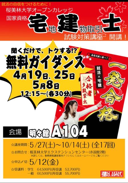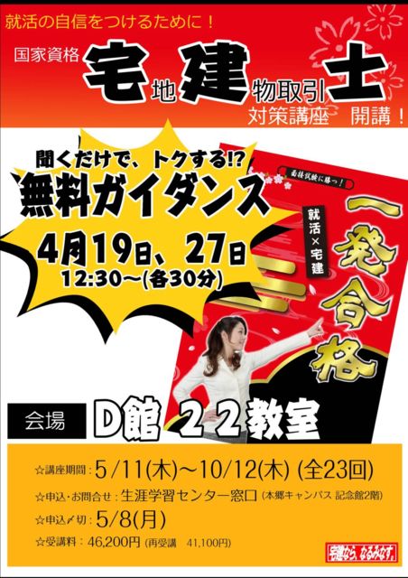 【★新生活も将来の就活対策も充実です★】 ガイダンス日程 4月19日(水)12:15〜 場所 明々館A104 みなさん宅建って、知ってますか 1 宅建=不動産業だけじゃない 不動産業に限らず、 建築・金融・保険・小売・外食産業など 幅広い分野で必要とされている資格です。 2 社会は、即戦力を求めている 学生時代に頑張った証として、 履歴書や面接でのアピールに非常に効果的です。 3 学生時代の今だからこそ 社会人になってから、仕事の勉強の両立は困難。 学生時代の今