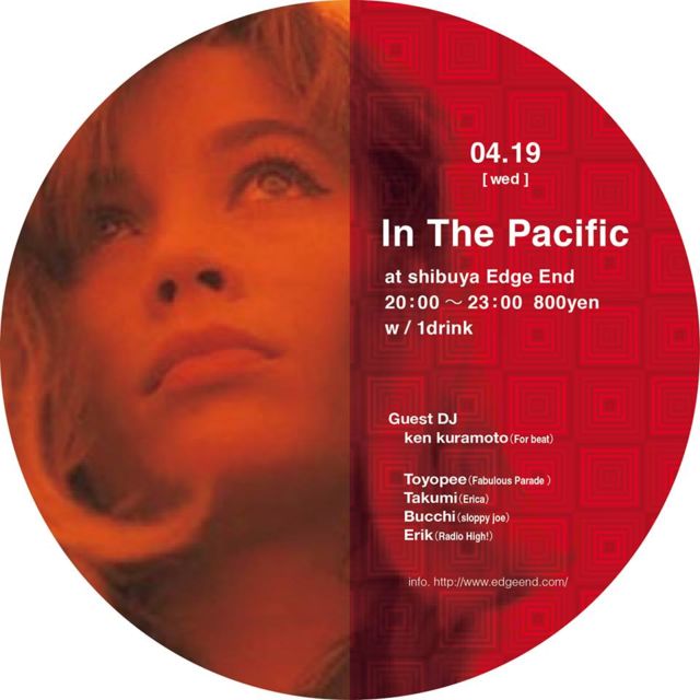 【In The Pacific 121】 2017/4/19(Wed) @渋谷Edge End http://www.edgeend.com/ 20:00〜23:00 800yen w/1d DJs: toyopee(Rainbow Chaser /A Love Song) takumi(Erica) Bucchi(sloppy joe) Erik(Radio High!) Guest DJ: ken kuramoto(For beat) **************************************************************** 今月のインパシは、田無のmusic Bar、For beatでプレイするSoulプレーヤー、ken kuramotoをゲストに迎えてお届けします! レギュラーDJも今回は特にテーマを決めず自由に楽しくプ