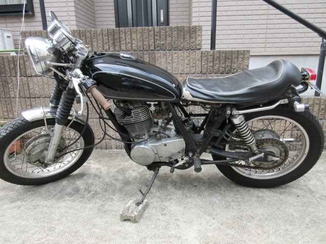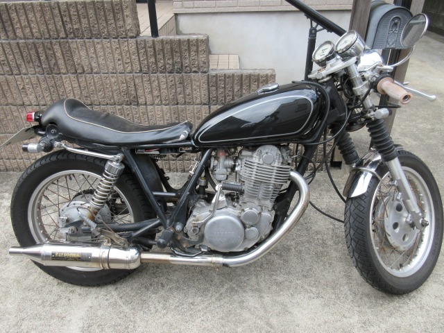 ・メーカー名:ヤマハ ・車名:SR400 ・年式: 平成7年 ・車体番号:1JR-30○○○○ ・2st/4st: 4st ・排気量: 400 ・色: 黒 ・自走: 可能 ・走行距離: メーター故障のため不明。(車検上18,500km) ・車検/自賠責の有無:廃車登録中の為、無し。 ・事故歴: 不明(私が所有中は駐車中の転倒が一度ありました。) ・キズや不具合の有無: 1. タンク左側に軽い凹み。 2. 速度メーターの故障。 3. シート破れ。 4. 前オーナーによるカギの紛失により、メインキーとガソリンタンクを開けるカギが2種類必要。 ・カスタム箇所や装