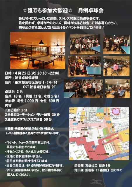 ²ñ¼Òµ¢¤ê¤Ë¤Á¤ç¤Ã¤È¤·¤¿±¿Æ°¡¢¥¹¥È¥ì¥¹È¯»¶¤ËºÇŬ¤Ê²ñ¤Ç¤¹¡£ Ã˽÷Ìä¤ï¤º¡¢Âîµå¤¬¤ä¤ê¤¿¤¤¿Í¡¢¶½Ì£¤¬¤¢¤ëÊý¤Ïʳ¤Ã¤Æ¸æ±þÊ礯¤À¤µ¤¤¡£ ¤´Ìµº»ÂÁ¿¶¤ê¤Ë³«ºÅ¡£ ½é»²²Ã¤ÎÊý¤â³Ú¤·¤ó¤Ç¤¤¤¿¤À¤±¤ë¥¤¥Ù¥ó¥È¤òÌܻؤ·¤Æ¤¤¤Þ¤¹¡£¢ö Æü»þ¡§4·î25Æü(²Ð) 20:30¡Á22:00 ¾ì½ê¡§½ÂëÂîµå¶æ³ÚÉô ½»½ê¡§ÅìµþÅÔ½Âë¶è½Âë1-14-14 EST½ÂëÅì¸ý²ñ´Û 9F ½Âë±Ø µÜ±×ºä¸ýÅÌÊ⣱ʬ Ãϲ¼Å´ ½Âë±Ø11Èֽиý ½Ð¤Æ¤¹¤° ÂîµåÂæ 4Âæ Äê°÷¡¡24̾ ¡ÊÃËÀ 15̾¡¢½÷À9̾¡Ë »²²ÃÈñ ÃËÀ 1,000±ß¡¡½÷À 500±ß ÆâÍÆ 1.¼«¸Ê¾Ò²ð 5ʬ 2.Á´°÷¤Ç¥í¡¼¥Æ¡¼¥·¥ç