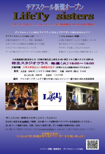 「チア体験会無料開催!!」 チアダンスユニットLifeTyの代表兼メンバーのAYAが講師を務めるチアスクール「LifeTy sisters」が6月から始まります! 毎週レッスンを重ねながらLifeTyと一緒にイベントに出演をし、人に元気と笑顔を届けられるチアリーダーを目指します。 習い事で人気のチア!LifeTyの元で始めてみませんか? 場所 小田急柿生駅徒歩2分スタジオsophia 時間 毎週(火)18:00〜19:00 対象 小学1年生〜高校生の女子 場所 渋谷駅徒歩6分のスタジオ 時間 毎週(水)20:00〜21:00 対象 中学生以上〜大人の女性 6月