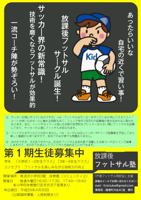 お世話になります、戸塚フットサル同好会からお知らせです。 5月4日のゴールデンウィークに以下の通り放課後フットサル塾のプレ開催企画として、親子フットサル教室を予定しています。 日時:平成29年5月4日 13時〜15時 場所:戸塚スポーツセンター 第1体育室 http://www.yspc.or.jp/sp/totsuka_sc_ysa/ 詳細は、以下フェイスブックページよりご確認下さい。 https://www.facebook.com/events/280509289042150/?ti=icl よろしくお願いいたします。 @@@@@@@@@@@@@@@@@@@@@@@@@@@ 5月から小学生向けの放課後フットサル塾をプレ開催い