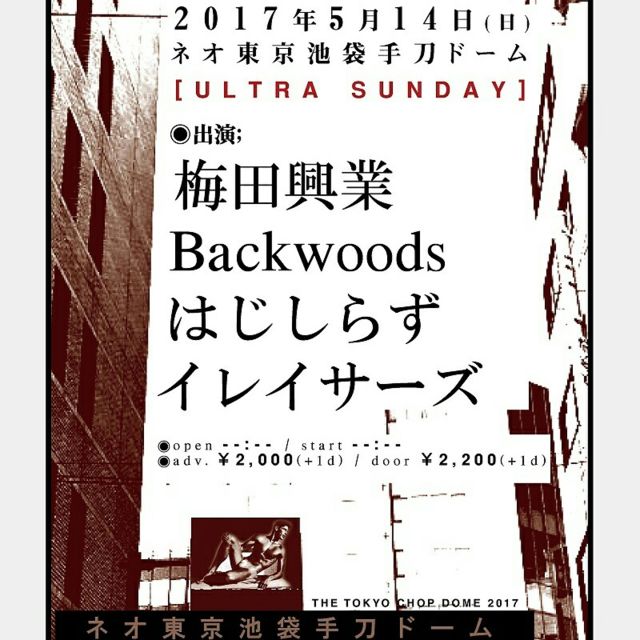 ²¿¤«¥È¥ê¤Ë¤Ê¤Ã¤Æ¤Þ¤¹¤¬¡Äf(^_^; 5/14(sun) [ULTRA SUNDAY] ÇßÅͽ¶È Backwoods ¤Ï¤¸¤·¤é¤º ¥¤¥ì¥¤¥µ¡¼¥º ¢£open 18:00 / start 18:30 ¢£adv. ¡ï2,000(+1d) / door ¡ï2,200(+1d) 18:00 OPEN 18:30 START 18:30-19:00 1. ¥¤¥ì¥¤¥µ¡¼¥º 19:15-19:45 2. ¤Ï¤¸¤·¤é¤º 20:00-20:30 3. Backwoods 20:45-21:15 4. ÇßÅͽ¶È ³§ÍÍ¡¢µ¹¤·¤¯¤ª´ê¤¤¤·¤Þ¤¹¡ª(^¿Í^)