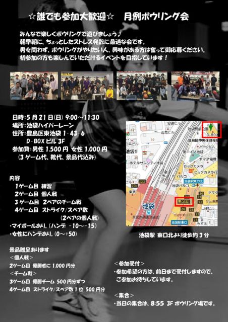 ¤ß¤ó¤Ê¤Ç³Ú¤·¤¯¥Ü¥¦¥ê¥ó¥°¤ÇÍ·¤Ó¤Þ¤·¤ç¤¦ (^O^)¡¿ Ä«¡¢ÁáÄ«¤Ë¤Á¤ç¤Ã¤È¤·¤¿¥¹¥È¥ì¥¹È¯»¶¤ËºÇŬ¤Ê²ñ¤Ç¤¹¡£ Ã˽÷Ìä¤ï¤º¡¢¥Ü¥¦¥ê¥ó¥°¤¬¤ä¤ê¤¿¤¤¿Í¡¢¶½Ì£¤¬¤¢¤ëÊý¤Ïʳ¤Ã¤Æ¸æ±þÊ礯¤À¤µ¤¤¡£ ½é»²²Ã¤ÎÊý¤â³Ú¤·¤ó¤Ç¤¤¤¿¤À¤±¤ë¥¤¥Ù¥ó¥È¤òÌܻؤ·¤Æ¤¤¤Þ¤¹¡£¢ö Æü»þ 5·î21Æü(Æü) 9:00¡Á11:30 ¾ì½ê ¥Ï¥¤¥Ñ¡¼¥ì¡¼¥ó ½»½ê ËÅç¶èÅìÃÓÂÞ1-43-6 D-BOX¥Ó¥ë3F ½¸¹ç 8:55 ¸½Ãϥܥ¦¥ê¥ó¥°¾ì 3F¼õÉÕ ¥¢¥¯¥»¥¹ ÃÓÂÞ±Ø ÅìË̸ý¤«¤éÅÌÊâ3ʬ http://www.hyperlane.com/contents/access/ ¡ÃÓÂÞ±Ø Åì¸ýËÌ ½Ð¸ý¤òÌܻؤ·¤Þ¤¹¡£ ¢Åì¸ýËÌ ½Ð¸ýÉÕ¶á¤ËÅì¸ýËÌ ¸ò