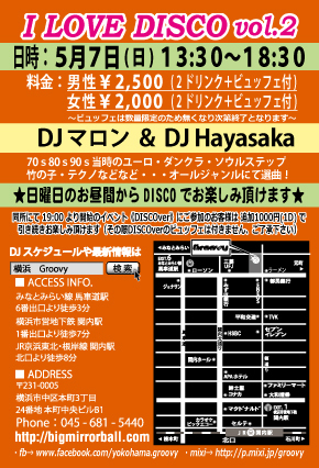 ¡úÁ°²ó4·î2Æü(Æü)¡§¤ªÃë´Ö³«ºÅ¥¤¥Ù¥ó¥È¤Î vol.2¤Ç¤¹¡ú ¤ª³°¤ÏÌÀ¤ë¤¯¤Æ¤âŹÆâ¤ÏDISCO¡ª¥Ç¥£¥¹¥³¡ª¡ª Â礤¤¥ß¥é¡¼¥Ü¡¼¥ë¤Î²¼¤Ç¸ʬ¤ËÍ٤äƤ¤¤¿¤À¤±¤Þ¤¹♬¡¡ ¢¾Ü¤·¤¯¤Ï¤³¤Á¤é¤â¤´Í÷¤¯¤À¤µ¤¤¢ https://www.facebook.com/events/213791222440891/ ¡ÚEntrance fee¡Û ÃËÀ¡ï2,500 / 2d ½÷À¡ï2,000 / 2d ¡ÚDJ's¡Û ¥Þ¥í¥ó / Hayasaka ¡Ú³«ºÅ»þ´Ö¡Û 13:30¡Á18:30 ¢¨ÅöÆüƱ½ê¤Ë¤Æ 19:00 ¤è¤ê³«»Ï¤Î¥¤¥Ù¥ó¥È¡ÔDISCOver¡Õ¤Ë¤´»²²Ã¤Î¤ªµÒÍÍ¤Ï ÄɲÃ1000±ß(1D) ¤Ç°ú¤Â³¤¤ª³Ú¤·¤ß失¤Þ¤¹¡Ê¤½¤ÎºÝDISCOver¤Î¥Ó¥å¥Ã¥Õ¥§¤ÏÉÕ¤¤Þ¤»¤ó¡¢¤´