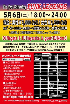 DISCO Groovy Ëè·îÂ裱ÅÚÍËÆü¤Ï¡ª¥Ï¥Þ¤Î½ÅÄáÔDJ Nagata¡Õ¤Ë¤è¤ëÄê´ü¥¤¥Ù¥ó¥È¡ÚFUNK LEGENDS¡Û Ĺǯ¤Î¥¥ã¥ê¥¢¤Ë΢ÉÕ¤±¤µ¤ì¤¿°ÂÄê´¶È´·²¤ÊPLAY¤ò¤É¤¦¤¾¤´´®Ç½¤¯¤À¤µ¤¤¡ª º£²ó¥¹¥Ú¥·¥ã¥ë¥²¥¹¥È¤È¤·¤Æ¡ÚDJ Nom3¡Û¤¬Groovy¤ËÅоì¤Ç¤¹¡ù ¡Ú²»³Ú¡Û¥ª¡¼¥ë¥¸¥ã¥ó¥ë Dance Classics¡¢Soul¡¢Funk¡¢R&B¡¢Hip-Hop¡¢EDM¡¢etc... ¡Ú³«ºÅ»þ´Ö¡Û 18¡§00¡Á24¡§00 ¡Ú¥Ï¥Ã¥Ô¡¼¥¢¥ï¡¼ÎÁ¶â / 18:00¡Á19:00¤Ë¤´ÍèŹ¤ÎÊý¡Û ÃËÀ¡§¡ï2,500/2Drinks¡Ü¥Ó¥å¥Ã¥Õ¥§ÉÕ ½÷À¡§¡ï2,000/2Drinks¡Ü¥Ó¥å¥Ã¥Õ¥§ÉÕ ¡ÚÎÁ¶â / 19:00°Ê¹ß¤´ÍèŹ¤ÎÊý¡Û ÃËÀ¡§¡ï3,000/2Drin