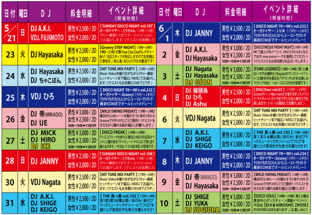 DISCO Groovy 5·î¤ÎÂè1¶âÍËÆü¤Ï¡ª¡ÚDJ A.K.I.¡õDJ Hayasaka¡Û¤Ë¤è¤ë¡ÔDiscotheque Friday Night¡ÕDISCO DJ¤Ê¤é¤Ç¤Ï¤ÎÀä̯¤Ê¥È¡¼¥¯¡õDJ¥×¥ì¥¤¤Ë¤Æ²£ÉͤΥ´¡¼¥ë¥Ç¥ó¥¦¥£¡¼¥¯¥Ê¥¤¥È¤òÀ¹¤ê¾å¤²¤Þ¤¹¡ª¥ê¥¯¥¨¥¹¥È¤Ë¤â½ÐÍè¤ë¸Â¤ê¤´ÂбþÃפ·¤Þ¤¹¤Î¤ÇDJ¤Þ¤Ç¤ªµ¤·Ú¤Ë¤É¤¦¤¾¢ö ¡Ú²»³Ú¡Û¥ª¡¼¥ë¥¸¥ã¥ó¥ë Soul¡¢Funk¡¢Dance Classics¡¢R¡õB¡¢EDM¡¢Euro¡¢etc... ¡Ú³«ºÅ»þ´Ö¡Û 18¡§00¡Á24:00 ¡Ú¥Ï¥Ã¥Ô¡¼¥¢¥ï¡¼ÎÁ¶â / 18:00¡Á19:00¤Ë¤´ÍèŹ¤ÎÊý¡Û ÃËÀ¡§¡ï2,500/2Drinks¡ÜÃæ²Ú¥Ó¥å¥Ã¥Õ¥§ÉÕ ½÷À¡§¡ï2,000/2Drinks¡ÜÃæ²Ú¥Ó¥å¥Ã¥Õ¥§ÉÕ ¡ÚÎÁ¶â / 19:00°Ê¹ß