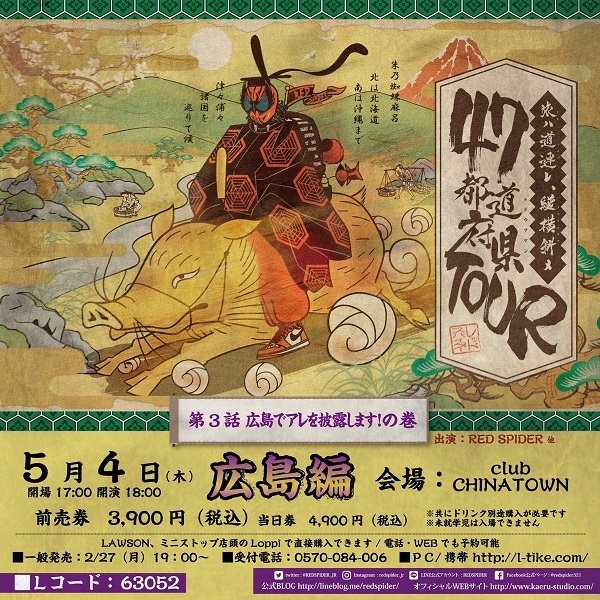 ¹Åç @club CHINATOWN (¹Å縩¹Åç»ÔÃæ¶è¶ä»³Ä®9-16) ³«¾ì 17:00 ³«±é 18:00 RED SPIDER ¾ Á°Çä 3900±ß(Àǹþ) ¢¨¥É¥ê¥ó¥¯ÂåÊÌÅÓɬÍפǤ¹¡£ ¢¨Ì¤½¢³Ø»ùÆþ¾ìÉÔ²Ä ¢£TICKET INFO ¥í¡¼¥½¥ó¥Á¥±¥Ã¥È 0570-084-006(L¥³¡¼¥É¡§63052) http://l-tike.com/search/?keyword=63052 ¢£¤ªÌ䤤¹ç¤ï¤» ¥«¥¨¥ë¥¹¥¿¥¸¥ª 06-6636-0226