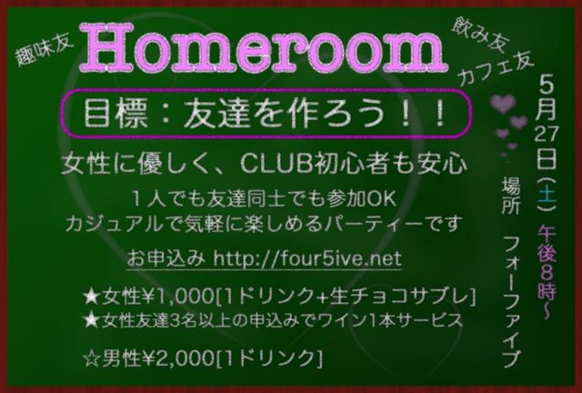 Four5iveは皆様のホームルームです。 新年度となり新生活を始めた方も多いと思います。 そこでFour5iveで友達作り・カフェ友・飲み仲間探し等いろいろなつながりを探してみませんか? 特徴 女性に優しくCLUB初心者の方も安心して楽しめます。 1人でもスタッフがフォローしますので安心してください。 もちろん友達同士の参加も大丈夫です。 連絡先の交換は自由です。 堅苦しい婚活パーティーではありません。 友達作りをメインとしたカジュアルなパーティーです。 参加費 女性:1,000円[1ドリンク+生チョコサブレ] 女性友達3名以上の