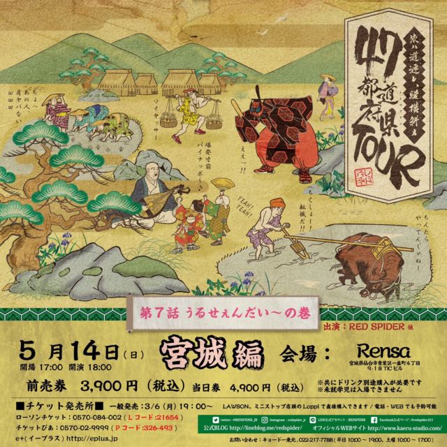 宮城 @Rensa (宮城県仙台市青葉区一番町4丁目9−18 TICビル) 開場 17:00 / 開演 18:00 チケット料金 前売 3,900円(税込) ※ドリンク代別途必要です ※未就学児入場不可 (出演) RED SPIDER 他 ■チケット発売所■ ローソンチケット:0570-084-002(Lコード:21654) http://l-tike.com/search/?keyword=21654 チケットぴあ:0570-02-9999(Pコード:326-493) http://ticket-search.pia.jp/pia/search_all.do?kw=326-493 e+(イープラス) http://eplus.jp 3月6日19時よりチケット発売開始 ■お問い合わせ キョードー東北. 022-2