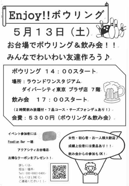 5·î13Æü¡ÊÅڡˤªÂæ¾ì¤Ç¥Ü¥¦¥ê¥ó¥°&°û¤ß²ñ¤ä¤ê¤Þ¤¹ ¤â¤Á¤í¤ó¡ª¤ª°ì¿ÍÍÍ¡¢½é»²²Ã¤ÎÊý¡¢¤ªÍ§Ã£¤È¤Î»²²Ã¤É¤ì¤âÂç´¿·Þ¤Ç¤¹♫ ¡Ê°û¤ß²ñ¤Î¤ß¤Î»²²Ã¤Ç¤âÂç¾æÉפǤ¹¡Ë °ì½ï¤Ë¥¹¥Ý¡¼¥Ä¤ò³Ú¤·¤ó¤Ç¤½¤Î¸å¤ª¼ò¤ò³Ú¤·¤ß¤Þ¤»¤ó¤«¡© À§È󤳤ε¡²ñ¤Ë²ñ¼Ò°Ê³°¤Ç¤â¤ªÍ§Ã£¤òºî¤Ã¤Æ³Ú¤·¤ß¤Þ¤·¤ç¤¦♫ »²²ÃÈñ:5,300±ß¡Ê°û¤ß²ñ¤Î¤ß3,500±ß¡Ë ¢¨¼Ò²ñ¿Í¤ÎÊý¤Î¤ß¤Î»²²Ã¤È¤Ê¤ê¤Þ¤¹(>_<) À§È󤪵¤·Ú¤Ë¥³¥á¥ó¥È¤¯¤À¤µ¤¤