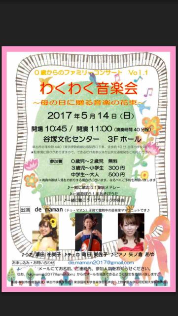 ¡Ú0ºÐ¤«¤é¤Î¥Õ¥¡¥ß¥ê¡¼¥³¥ó¥µ¡¼¥È ¤ï¤¯¤ï¤¯²»³Ú²ñ¡ÁÊì¤ÎÆü¤Ë£¤ë²»³Ú¤Î²Ö«💐¡Á¡Û 5·î14Æü(Æü) ëÄÍʸ²½¥»¥ó¥¿¡¼3³¬¥Û¡¼¥ë ³«¾ì:10:45 ³«±é11:00 ¥×¥í¥°¥é¥à(µÙ·Æ¤Ê¤·40Ê¬Äø) ¢ö°ì½ï¤Ë²Î¤ª¤¦¡ªÆ¸ÍØ¥á¥É¥ì¡¼ ¢ö°ì½ï¤ËÍ·¤Ü¤¦¡ª¼ê¤¢¤½¤Ó¤¦¤¿ ¢ö°ì½ï¤Ëݤ³¤¦¡ª¥¯¥é¥·¥Ã¥¯¤Î̾¶Ê ¡Ô»²²ÃÈñ¡Õ 0ºÐ¡Á2ºÐ ̵ÎÁ 3ºÐ¡Á¾®³ØÀ¸ 300±ß Ãæ³ØÀ¸¡ÁÂç¿Í 500±ß (¤ª»Ò¤µ¤ó¤Ï¥×¥ì¥¼¥ó¥È¤¢¤ê) Äê°÷50ÁÈ µã¤¤¤Á¤ã¤Ã¤Æ¤âÂç¾æÉס£¤ª»Ò¤µ¤ó¤È°ì½ï¤Ë²»³Ú¤Ë¿¨¤ì¤Æ¤ß¤Þ¤»¤ó¤«¡© ¤¦¤¿¤È¥Á¥§¥í¤È¥Ô¥¢¥Î¤Î¤Ë¤è¤ë¥³¥ó¥µ¡¼¥È¤Ç¤¹¡£ ¤ª¤â¤Á¤ã¤Î¥Á¥ã¥Á¥ã¥Á¥ã¡¢Â礤ʸŻþ·×¡¢¥¥é