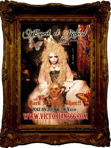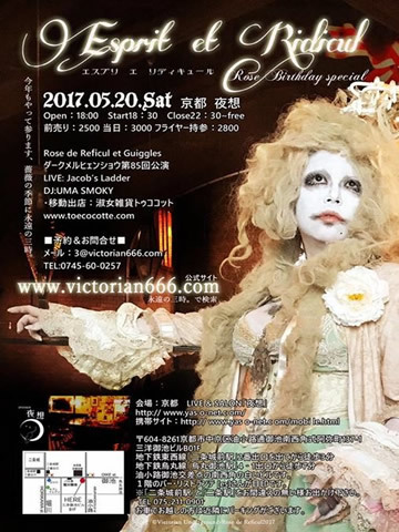 5/20(土) 「Esprit et Ridicul Rose Birthday Special 〜Rose de Reficul et Guiggles ダークメルヒェンショウ第85回公演」 LIVE:Jacob’s Ladder DJ:UMA SMOKY 移動出店:淑女雑貨トゥココット www.toecocotte.com OPEN 18:00 / START 18:30 Close 22:30〜free 前売 \2500 / 当日 \3000 / フライヤー持参 \2800 (共に+1drink \500) ■予約&お問い合せ■ メール:3@victorian666.com TEL:0745-60-0257 www.victorian666.com ※前売予約は、夜想メールでも受付致します。 livesalon.yaso@gmail.com お問い合わせ:夜