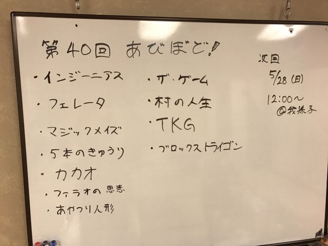 【日時】平成29年5月28日(日) 12:00〜20:50 ※途中入退場は自由です 【場所】我孫子市民プラザ 和室 (JR常磐線 我孫子駅より徒歩5分) http://members3.jcom.home.ne.jp/abikopla/index.html (無料駐車場あり) 【参加費】500円 【定員】25名 ----------------------------------------------------------------- コミュ主様、場所をお借りします。 東葛地域でのボードゲームをもり立てるために我孫子でもゲーム会を立ち上げました。 ボードゲーム初心者からベテランゲーマーまでが気軽に楽しめる会を目指