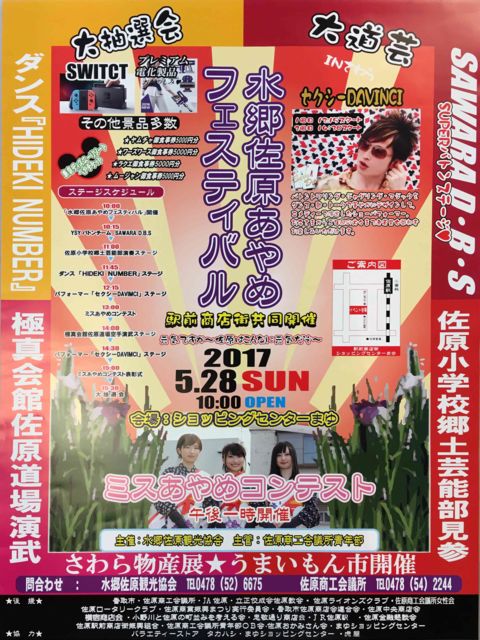 5/28(日)は水郷佐原あやめフェスティバル。 場所は佐原駅前商店街・ショッピングセンターまゆ。 セクシーDAVINCIのショーは12:15と14:30。 バトントワリング・ジャグリング・マジック等をダンス・歌・トークで華やかにデザイン、笑いとセクシーで演出したショーパフォーマー。お子さまからご年配の方まで老若男女問わずお楽しみいただけます。 抽選でNintendo Switchを当ててください。