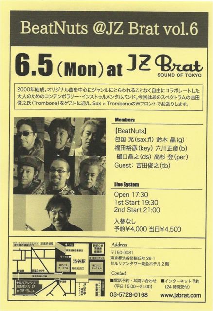 2000ǯ·ëÀ®¡£¥ª¥ê¥¸¥Ê¥ë¶Ê¤òÃæ¿´¤Ë¥¸¥ã¥ó¥ë¤Ë¤È¤é¤ï¤ì¤ë¤³¤È¤Ê¤¯¼«Í³¤Ë¥³¥é¥Ü¥ì¡¼¥È¤·¤¿Âç¿Í¤Î¤¿¤á¤Î¥³¥ó¥Æ¥ó¥Ý¥é¥ê¡¼¡¦¥¤¥ó¥¹¥È¥¥¥ë¥á¥ó¥¿¥ë¥Ð¥ó¥É¡£º£²ó¤Ï¤¢¤Î¥¹¥Ú¥¯¥È¥é¥à¤ÎµÈÅĽÓÇ·»á¡ÊTrombone¡Ë¤ò¥²¥¹¥È¤Ë·Þ¤¨¡¢Sax ¡ß Trombone¤ÎW¥Õ¥í¥ó¥È¤Ç¤ªÁ÷¤ê¤·¤Þ¤¹¡£ ¤³¤Î»þ¤Ç¤Ê¤¤¤È½ÐÍè¤Ê¤¤Ä°¤±¤Ê¤¤¶Ê¤ä¤ê¤¿¤¤¤È»×¤¤¤Þ¤¹¡£ ¡ÖBeatNuts at Jz Brat Vol,6¡× Êñ¹ñ ½¼¡Êsax,fl¡Ë ÎëÌÚ ¾½¡Êg¡Ë Ê¡ÅÄ͵ɧ¡Êkey¡Ë Ï»ÀîÀµÉ§¡Êb¡Ë Èõ¸ý¾½Ç·¡Êds¡Ë ¹â¿ù ÅСÊper¡Ë Guest¡§ µÈÅĽÓÇ·¡Êtb¡Ë 6/5 (·î) Open 17:30 1st Start 19:30 2nd Start 21:00 Liv