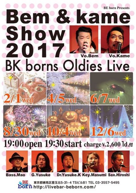 ÎýÇÏmusic & live bar BEborn ËÜÆü¡¢6·î5Æü(·îÍËÆü). ÌÀÆü¡¢6·î6Æü(²ÐÍËÆü)¤Ï¡¢ ¡ÚŹµÙÆü¡Û ÌÀ¸åÆü¡¢6·î7Æü¡Ê¿åÍËÆü¡Ë¤Ï¡¢ BK BORN'S ¥ª¡¼¥ë¥Ç¥£¡¼¥º¥ï¥ó¥Þ¥ó¥é¥¤¥Ö ¡ÚBem & Kame Show¡Û ¤ò¤ª¤³¤Ê¤¤¤Þ¤¹¡£ open 19:00 start 19:30 charge2600±ß (1¥É¥ê¥ó¥¯ÉÕ¤¡Ë 1st stage 19:30-20:00 2nd stage 20:30-21:00 3rd stage 21:30-22:00 ³§ÍÍ¡¢À§ÈóÍ·¤Ó¤Ë¤¤¤é¤·¤Æ¤¯¤À¤µ¤¤¤Í¡£ ¤ªÂÔ¤Á¤·¤Æ¤ª¤ê¤Þ¤¹¡£ ¡ú¤ªµ¤³Ú¥é¥¤¥Ö(¥Î¥ë¥Þ̵¤·)½Ð±é¼ÔÊç½¸Ãæ¡ª ¤ªµ¤³Ú¥é¥¤¥Ö¾ÜºÙ ¤ªµ¤³Ú¥é¥¤¥Ö¤È¤Ï¡¢½Ð±é¼Ô¤Î³§Íͤɤ¦¤·¤¬¡¢¤ª¸ß¤¤¤Î¤ªµÒÍͤȤÊ