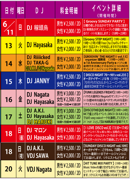 DISCO Groovy 6月の第1&第3火曜日は VDJ Nagataによる【HIT TUNE MIX PARTY】SOUL、FUNK、DANCE CLASSICS、70's〜最新HIT曲までMusic Videoを織り交ぜつつかけまくります!リクエストにも出来る限りお応え致しますのでVDJまでお気軽にどうぞ♪ 【音楽】ALL MIX 【開催時間】19:00〜24:00 【料金】 男性:¥2,500/2Drinks+ビュッフェ付 女性:¥2,000/2Drinks+ビュッフェ付 ビュッフェは数量限定のためなくなり次第終了となります。ご了承ください。 【VDJ】Nagata