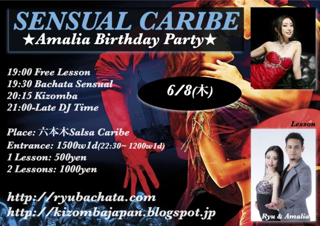 Kizomba & Bachata social held every thursday in Roppongi famous latin club SALSA CARIBE. Lesson by Ryu & Amalia. Amalia birthday kizomba and bachata from 22:00