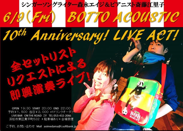 BOTTO ACOUSTICはついに10回目を迎えます みんなで楽しく盛り上がりましょー^^♪ ご予約開始しますー!! 2017年6月9日(金)LIVE BAR ON THE ROAD2Fにて ワンマンライブ”BOTTO ACOUSTIC 10th Anniversary!!” ◆エイジ濃度★★★★★MAX ★開場 19:30 開演 20:00 閉演 22:00 ◆料金 ご予約¥1.500 当日¥2,000 +1ドリンクオーダー ◆内容 ロックの日に記念すべき第10回開催を行います!! 初の試みで、今回だけ”全編リクエスト制”となります。 ・森永エイジの曲 ・邦楽洋楽、新旧問わず一般の曲(カバー)