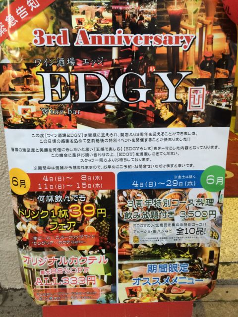 【覚書】 参加者 男性1名女性3名 計4名 費用1人2050円 二次会実施 全員参加 アイリッシュパブにて 費用1人2000円程度 2時間制 39円ドリンクは生ビール以外は シャンパン、ワインと シャンパン・ワイン系のカクテルのみ 自家製サングリア有り 開始時間勘違い 当日予約ねじ込み席取れる 0次会 柳橋市場散策と 名古屋駅コメ兵内カップスにて カフェタイムで時間潰し(^_^;) 皆さまこんばんは。 梅雨入りなんて吹っ飛ばせ。という事で 名古屋駅近のワインバーで早い時間から呑んだくれませんか? お店の周年記念で 何でも一