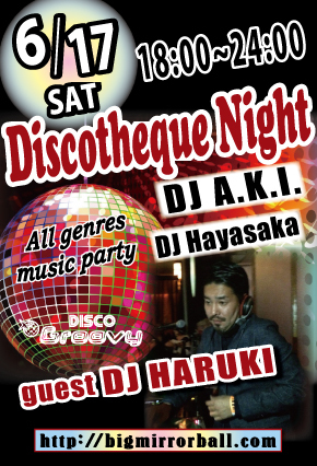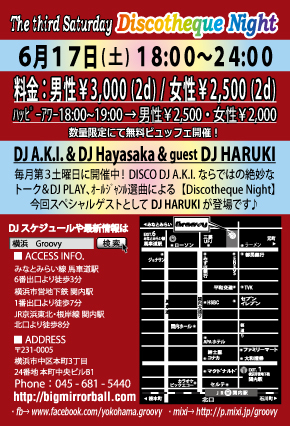 6月も第3土曜日は!【DJ A.K.I.】による《Discotheque Night》DISCO DJならではの絶妙なトーク&DJプレイにて横浜のサタデーナイトを盛り上げます! リクエストにも出来る限りお応え致しますのでDJまでお気軽にどうぞ♪ 今回はスペシャルゲストとして【DJ HARUKI】がGroovyに登場です☆ 【音楽】オールジャンル Soul、Funk、Dance Classics、Hip-Hop、R&B、EDM、Eurobeat、etc... 【開催時間】 18:00〜24:00 【ハッピーアワー料金 / 18:00〜19:00にご来店の方】 男性:¥2,500 / 2Drinks+ビュッフェ付 女性:¥2,000 / 2Drinks+ビ