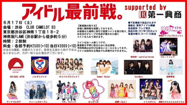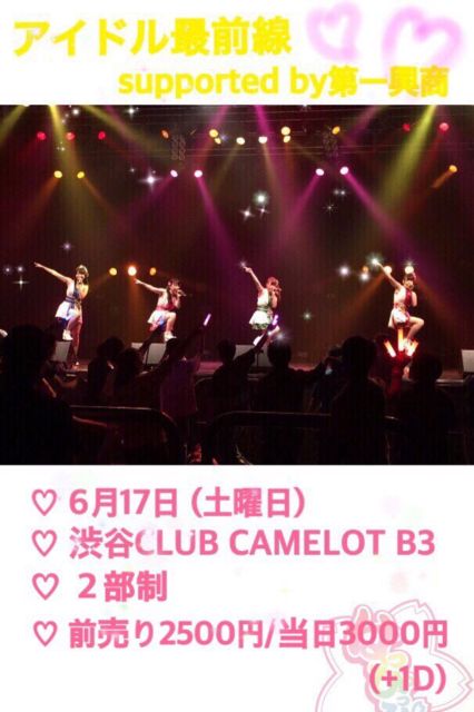 「アイドル最前戦。2部」 日時:6/17(土) 開場16:00 / 開演16:30 会場:渋谷CLUB CAMELOT B3 料金:前売2,500円 / 当日3,000円(1D別) 出演:神様アイドルプロジェクト/迷愛ヘルプ!/ティーンズ☆ヘブン/メトロポリス/SoulMate/空野青空/です。ラビッツ/はっぴっぴ