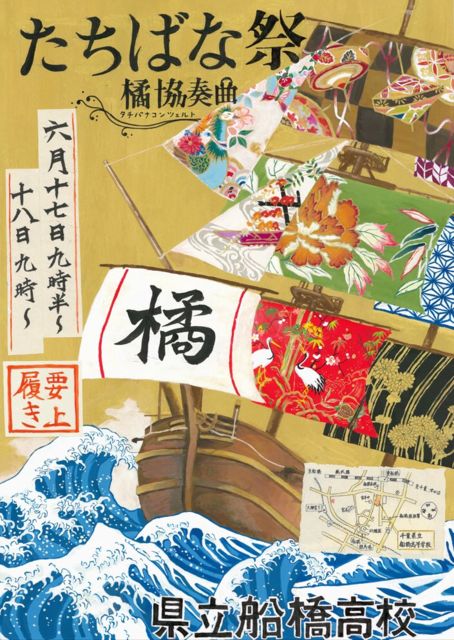 今年のたちばな祭について 2017年度のたちばな祭は、以下のとおり行われます。 場所 千葉県立船橋高等学校・周辺図 (JR総武線東船橋駅徒歩7分、京成電鉄船橋競馬場駅徒歩12分) 発表日 2017年6月17日(土)・6月18日(日) 発表時間 17日(土):9時30分開場 16時終了(15時30分入場受付終了) 18日(日):9時開場 15時終了(14時30分入場受付終了) 注意事項 上履きやスリッパと靴袋をご持参ください。ご協力をお願いします。 車でのご来場の際は東船橋駅付近のパーキングエリアをご利用ください。 当日は