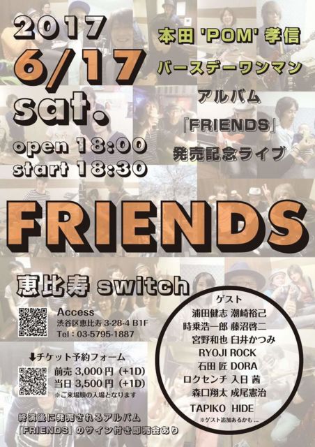■恵比寿天窓.switch http://otonami.com/switch_top Open 18:00 / Start 18:30 前売 3000円 / 当日 3500円(共に+1D別) ☆ゲスト☆ 浦田健志 時乗浩一郎 宮野和也 RYOJI ROCK 石田 匠 ロクセンチ 森口翔太 TAPIKO HIDE 随時追加発表! *終演後に発売されるアルバム『FRIENDS』 のサイン付き即売会あり チケットフォーム https://ssl.formman.com/form/pc/4PpZKoSN4YqG2mz7/ ※ご来場順の入場になります。 ↓can/gooメルマガ購読ご希望の方はこちらから↓ https://ssl.formman.com/form/pc/0gjkqDsRTUsrdu