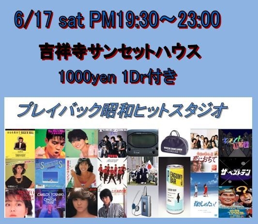 懐かしい昭和のアイドル・歌謡曲・POPやTV番組、流行りモノなど みんなでワイワイ飲んで、歌って、踊って楽しもうるんるん モニターでは当時のTV番組が流れてるよTV DJ CHIAKIのオールナイトニッポンあり 参加者全員に懐かしいアイドル歌謡曲のDVDをプレゼントしますプレゼント 今回は夏歌満載波 みんなで80年代のビーチにタイムスリップぴかぴか(新しい) 6/17 sat PM19:30〜23:00 吉祥寺サンセットハウス 1000円ワンドリンク付き アクセス:東京都武蔵野市吉祥寺本町1-10-9 冨澤ビル3F (公園通り、吉祥寺第一ホテル向