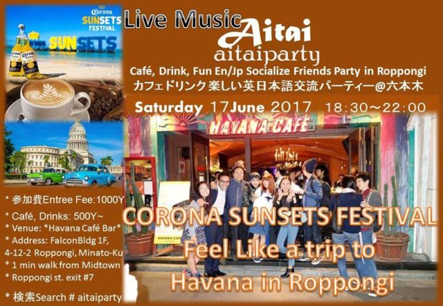 Aitai Exciting Live Music Special EN/JP Friends Socialize Party ¡ÈCORONA BEER¡É & ¡ÈHAVANA Café Bar¡É (CORONA SUNSETS FESTIVAL) Are you looking to increase your circle of Japan Local & International friends? Meet People & Make Real friends? Simply wanna enjoy a party! Listen and dance with the live music, Enjoy the Café and the Drinks & 500Yen CORONA BEER @ CORONA SUNSETS FESTIVAL ¥¤¥Ù¥ó¥È¤òÄ̤·¤Æ¹ñºÝŪ¤Êͧã¤ÎÎØ¤â¹¤²¤¿¤¤¤È»×¤¤¤Þ¤»¤ó¤«¡© ¡ÖÏ»ËÜÌڤ˹ԤäƤߤ¿¤¤¡¢¡¢³Ú¤·¤¤¥Ñ¡¼¥Æ¥£¡¼