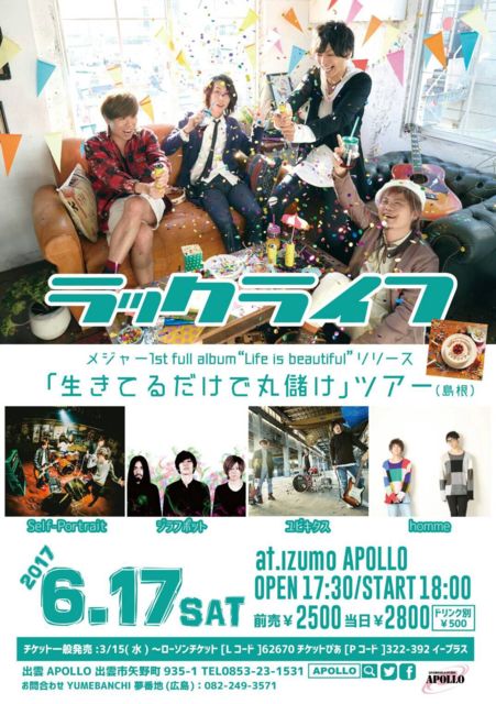 6/17(sat) ½Ð±ÀAPOLLO ¥é¥Ã¥¯¥é¥¤¥Õ ¥á¥¸¥ã¡¼1st Full Album ¡ÈLife is beautiful¡É¥ê¥ê¡¼¥¹¡ÖÀ¸¤¤Æ¤ë¤À¤±¤Ç´ÝÌÙ¤±¡×¥Ä¥¢¡¼ ¡ãCAST¡ä homme ¥é¥Ã¥¯¥é¥¤¥Õ Self-Portrait ¥¸¥é¥Õ¥Ý¥Ã¥È ¥æ¥Ó¥¥¿¥¹ O/S 17:30/18:00 A/D 2500yen/2800yen homme¤Î½Ð±é»þ´Ö¤Ï¸åÆü¸ø³«¡£ ¡ã¥Á¥±¥Ã¥È¼è¤ê°·¤¤¡ä ¥í¡¼¥Á¥±(L¥³¡¼¥É:62670)/¥Á¥±¥Ã¥È¤Ô¤¢(P¥³¡¼¥É:322-392)/¥¤¡¼¥×¥é¥¹/³Æ½Ð±é¼ÔͽÌó ¥Á¥±¥Ã¥ÈͽÌó¤Ï¡¢¥á¡¼¥ë·ï̾¤Ë¡Ö¥Á¥±¥Ã¥ÈͽÌó¡×¡¢ËÜʸ¤Ë¡Ö¸ø±éÆü¡¦¥«¥¿¥«¥Ê¥Õ¥ë¥Í¡¼¥à¡¦Ëç¿ô¡×¤òÌÀµ¤Î¾å¡¢hommehomme777@gmail.com¤Þ¤Ç¡£ µ×¡¹¤Î½Ð±À
