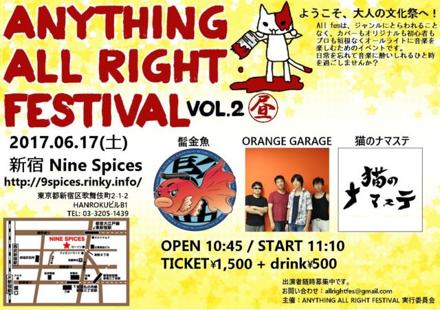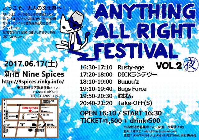 ¡Øanything allright festival¡Ê¥ª¥ë¥Õ¥§¥¹¡Ë¡Ùvol.2³«ºÅ¡ª¡ª ÆüÄø¡§2017ǯ6·î17Æü ¡ÊÅÚ¡Ë ²ñ¾ì¡§9spices http://9spices.rinky.info/ ¥Á¥±¥Ã¥ÈÂå¡§1500+drink500 Âè°ìÉô Ãë¡Ê¥ª¥ê¥¸¥Ê¥ë¤ÎÉô¡Ë11»þ10ʬ¡Á ½Ð±é¥Ð¥ó¥É ¡¦ñþ¶âµû ¡¦ORANGE GARAGE ¡¦Ç¤Î¥Ê¥Þ¥¹¥Æ ÂèÆóÉô Ìë¡Ê¥³¥Ô¡¼¤ÎÉô¡Ë16»þ30ʬ¡Á ½Ð±é¥Ð¥ó¥É ¡¦Rusty-AGE¡ÊBOØWY¡Ë ¡¦DICK¥é¥ó¥Ç¥Ö¡¼¡Ê¥æ¥Ë¥³¡¼¥ó¡Ë ¡¦Buuuu'z¡ÊB¡Ç£ú¡Ë ¡¦Bugs Force¡Ê¥ß¥¹¥Á¥ë+¥ª¥ê¥¸¥Ê¥ë¡Ë ¡¦ÃӤѤó¡Ê¤¤¤í¤¤¤í¥Ñ¥ó¥¯¡Ë ¡¦Take-OFF¡ÊS¡Ë¡Ê¥¸¥å¥ó¥¹¥«+¥¸¥§¥Ã¥Èµ¡¡Ë ¢¨Âè°ìÉô¡¢ÂèÆóÉô¡¢Æ±