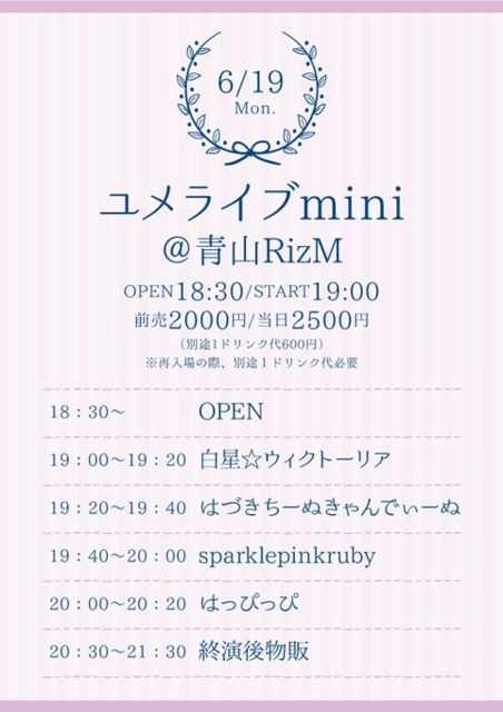 「ユメライブmini」 日時:6/19(月) 開場18:30 / 開演19:00 会場:青山RizM 料金:前売2,000円 / 当日2,500円(1D別600円)※再入場可(要1D) 出演:白星☆ウィクトーリア/はづきちーぬきゃんでぃーぬ/sparklepinkruby/はっぴっぴ 出演:20:00〜20:20 物販:終演後 (20:30〜21:30)