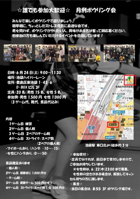 ¤ß¤ó¤Ê¤Ç³Ú¤·¤¯¥Ü¥¦¥ê¥ó¥°¤ÇÍ·¤Ó¤Þ¤·¤ç¤¦ (^O^)¡¿ Ä«¡¢ÁáÄ«¤Ë¤Á¤ç¤Ã¤È¤·¤¿¥¹¥È¥ì¥¹È¯»¶¤ËºÇŬ¤Ê²ñ¤Ç¤¹¡£ Ã˽÷Ìä¤ï¤º¡¢¥Ü¥¦¥ê¥ó¥°¤¬¤ä¤ê¤¿¤¤¿Í¡¢¶½Ì£¤¬¤¢¤ëÊý¤Ïʳ¤Ã¤Æ¸æ±þÊ礯¤À¤µ¤¤¡£ ½é»²²Ã¤ÎÊý¤â³Ú¤·¤ó¤Ç¤¤¤¿¤À¤±¤ë¥¤¥Ù¥ó¥È¤òÌܻؤ·¤Æ¤¤¤Þ¤¹¡£¢ö Æü»þ 6·î24Æü(ÅÚ) 9:00¡Á11:30 ¾ì½ê ¥Ï¥¤¥Ñ¡¼¥ì¡¼¥ó ½»½ê ËÅç¶èÅìÃÓÂÞ1-43-6 D-BOX¥Ó¥ë3F ½¸¹ç 8:55 ¸½Ãϥܥ¦¥ê¥ó¥°¾ì 3F¼õÉÕ ¥¢¥¯¥»¥¹ ÃÓÂÞ±Ø ÅìË̸ý¤«¤éÅÌÊâ3ʬ http://www.hyperlane.com/contents/access/ ¡ÃÓÂÞ±Ø Åì¸ýËÌ ½Ð¸ý¤òÌܻؤ·¤Þ¤¹¡£ ¢Åì¸ýËÌ ½Ð¸ýÉÕ¶á¤ËÅì¸ýËÌ ¸ò