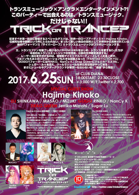 ==================== 2017/6.25(Æü) 18:00-23:30 ¡ÚTRICK or TRANCE?¡Û @ ¶äºÂ DIANA Door¡ï3000 w/F, Twitter³ä¡ï2700 ==================== ¥«¥Ã¥Æ¥£¥ó¥°¥¨¥Ã¥¸¤Ê¥È¥é¥ó¥¹¥Ñ¡¼¥Æ¥£¡¼¤¬ÅŷⳫºÅ·èÄê!! ¥È¥é¥ó¥¹¡ß¥¢¥ó¥°¥é¡ß¥¨¥ó¥¿¡¼¥Æ¥¤¥ó¥á¥ó¥È¡£ ¤³¤Î¥Ñ¡¼¥Æ¥£¡¼¤Ç½Ð²ñ¤¨¤ë¤Î¤Ï¡¢¥È¥é¥ó¥¹¥ß¥å¡¼¥¸¥Ã¥¯¡¢¤À¤±¤¸¤ã¤Ê¤¤!! µÇ°¤¹¤Ù¤Âè°ì²óÌܤËÅо줹¤ë¥¹¥Ú¥·¥ã¥ë¥²¥¹¥È¤Ï¡¢À¤³¦°ì¤Î¥í¡¼¥×¥¢¡¼¥Æ¥£¥¹¥È¡¦Hajime Kinoko¡£ Èà¤Î¥í¡¼¥×¥¢¡¼¥È¤ÏÅÁÅýŪ¤ÊÆì¤ä¶ÛÇû¤È¤¤¤¦ÏȤˤȤé¤ï¤ì¤Ê¤¤¡¢¤Þ¤Ã¤¿¤¯¿·¤·¤¤ÆÈ¼«¤Î·Ý½Ñ¤È¤·¤ÆÀ¤³¦Ã椫¤é¾Þ»¿¤µ