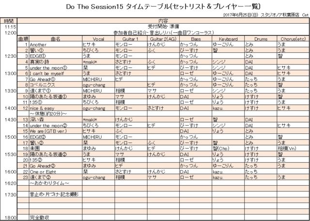 Do As Infinityセッション会、第15回のご案内です! 日付:2017年6月25日(日) 場所:スタジオノア秋葉原店 Cst + sub URL: http://akihabara.studionoah.jp/ 時間:12:00〜18:00(11:00〜12:00準備) 参加費:1400円(見学500円) ☆Do The Session 15 セットリスト http://mixi.jp/view_bbs.pl?id=82700265&comm_id=1851939 ・打上げについて うおや一丁 秋葉原店 18:30〜 https://r.gnavi.co.jp/e030302/ 2h飲み放題付コース 3500円(税込) 【連絡事項・注意事項】 連絡事項及び注意事項に関しては下記の別トピックをご