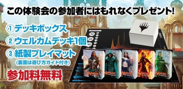 【初心者講習会】ティーチングキャラバン のご案内です。 受付は 予約 16:45〜17:00 当日 17:00 となっておりますので参加希望の場合は上記の時間に遅れないようにご来店ください。 参加費は無料です。 ティーチングキャラバンとは、マジックが未経験の方や始めたばかりのプレイヤーに向けた無料の体験会です。 公式HP→http://teaching.mtg-jp.com/# ティーチングキャラバンにご参加頂いた方にはもれなく デッキボックス ウェルカムデッキ1個 紙製プレイマット(裏面には遊び方ガイド付き) を差し上げます。 MTGのカード