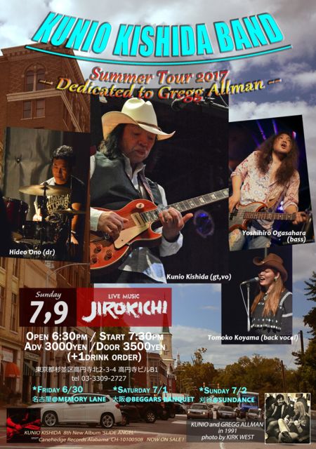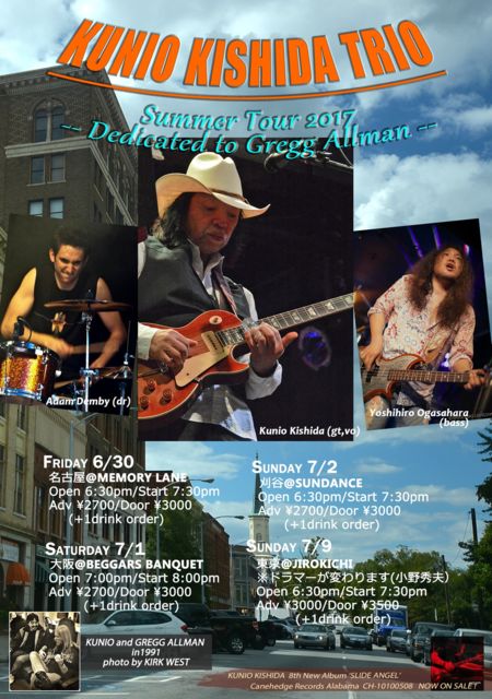 ******* 2017 SUMMER LIVE ******* "Dedicated to GREGG ALLMAN" -KUNIO KISHIDA TRIO- ・KUNIO KISHIDA (gt,vo) ・小笠原義弘 (bass,cho) ・Adam Demby (dr) 6/30, 7/1, 2 ・小野秀夫 (dr) 7/9 ******************************** ■6月30日(金)名古屋メモリーレーン 開場:6時30分 開演:7時30分 予約 2,700円+1drink 当日 3,000円+1drink http://www.memorylane-info.com/ ■7月1日(土)大阪ベガーズバンケット 開場:7時 開演:8時 予約 2,700円+1drink 当日 3,000円+1drink https://www