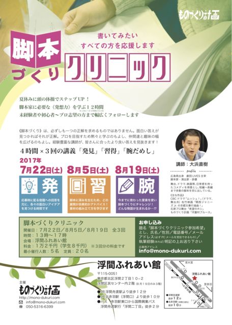 夏休みに頭の体操でステップUP! 脚本家に必要な《発想力》を学ぶ12時間(4時間×3回) 未経験者や初心者〜プロ志望の方まで幅広くフォローします! ●脚本づくりクリニックとは… 《脚本づくり》は、必ずしも一つの正解を求めるものではありません。面白い答えが見つかればそれが正解。プロを目指すため黙々と学ぶのもよし、仲間達と趣味の幅を広げるのもよし。経験豊富な講師が、皆さんに合ったより良い答えを見抜きます! ●開催日/内容 【第1回】7月22日(土)テーマ「発見」 応募時に配る宿題への回答を元に、各々の面